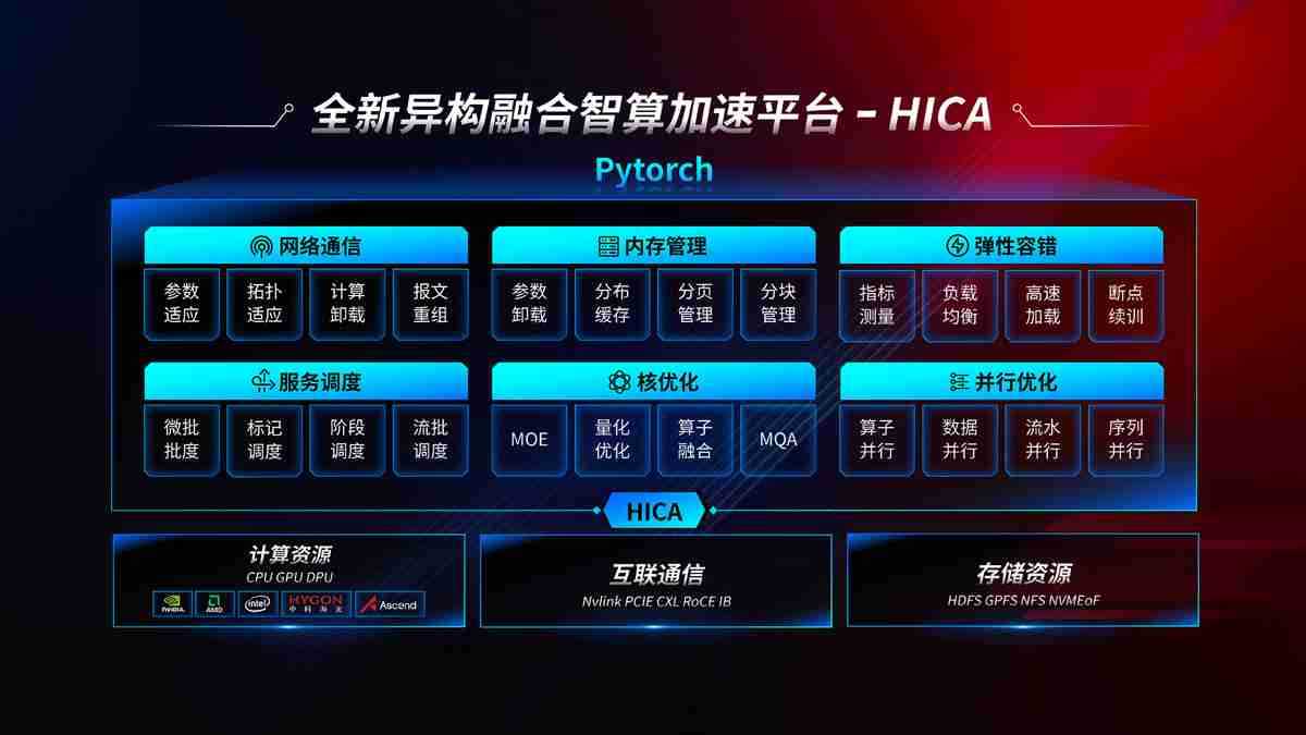 通过自研的服务层、、中间适配层、、、以及调度编排算法,,采用数据并行、、、模型并行等多种并行方式,,,,把并行计算任务进行有效的分解,,,,使其分别由相应的软件栈和算力资源来承接。。。当GPU资源变化,,HICA可以实时动态调度计算子任务并调整模型拓扑和架构,,,,以充分聚合各种算力资源。。。。