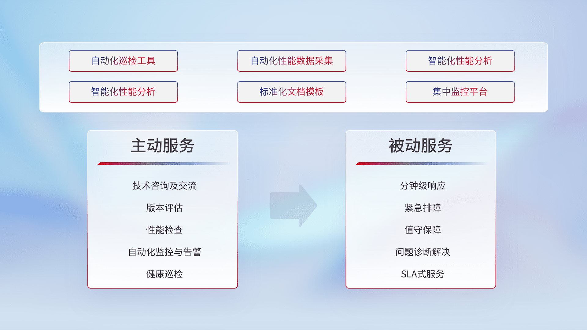 智能化工具和标准化文档,,,,保障服务质量,,提供主动服务(包含技术咨询、、版本评估、、、、性能检查、、、、自动化监控与告警、、健康巡检)和被动服务包含(分钟级响应、、紧急排障、、、值守保障、、、问题诊断解决、、、、SLA服务)。。。